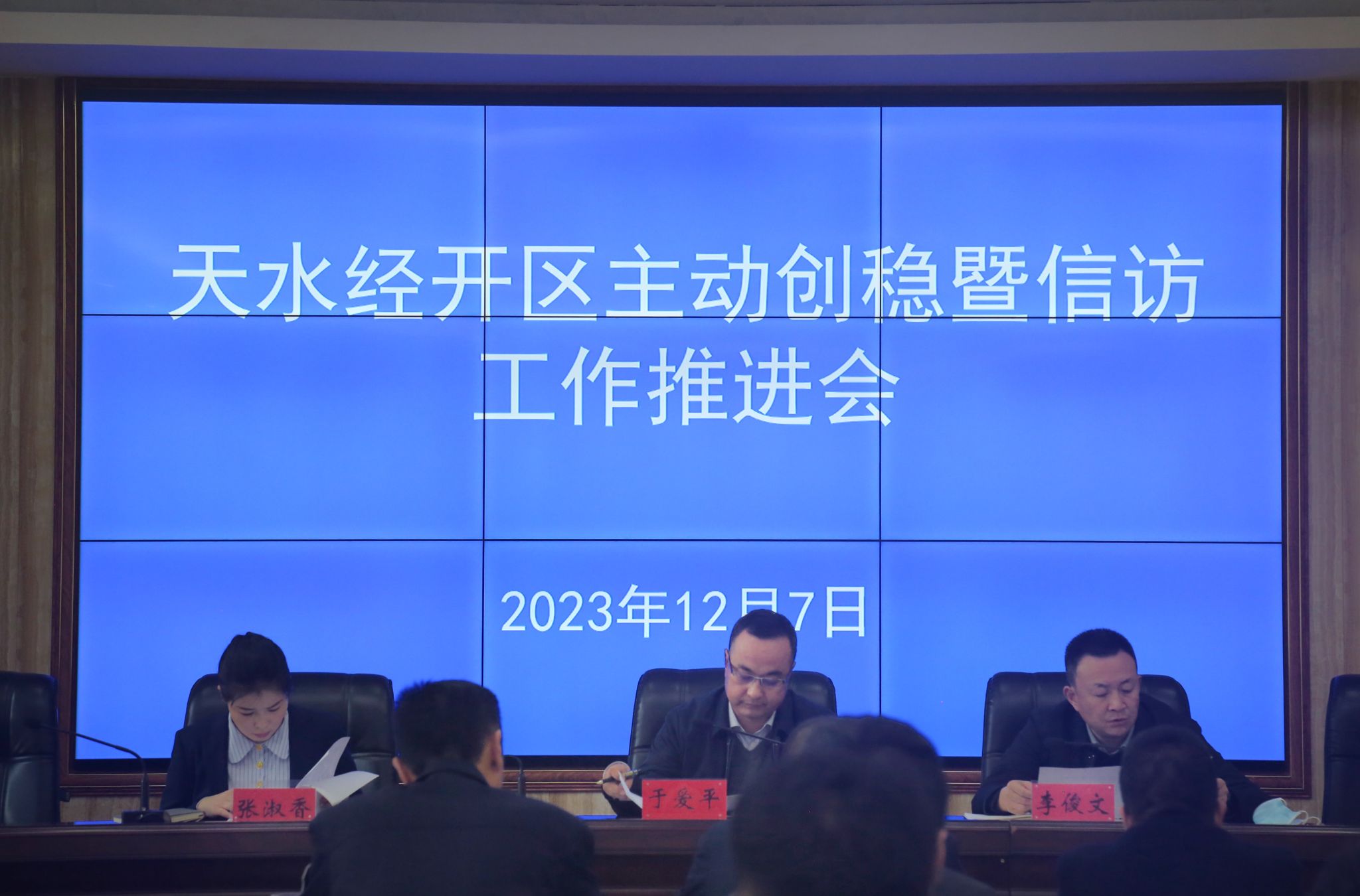 12月7日,天水经开区召开主动创稳暨信访工作推进会议,传达省信访工作联席会议全体(扩大)及全市主动创稳暨重点领域信访工作推进会议精神,推进经开区主动创稳重点工作,部署推动信访问题化解。党工委副书记、纪检监察工委书记于爱平同志主持会议并讲话,管委会副主任李俊文、张淑香出席会议并就各自分管领域进行相关安排部署。