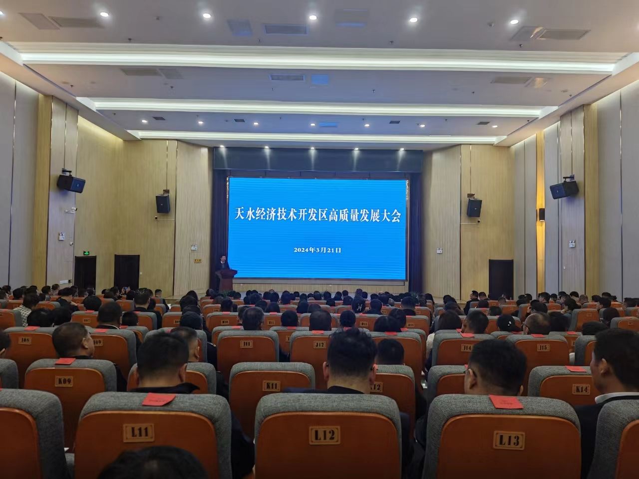 3月21日,天水经济技术开发区召开高质量发展大会,全面贯彻省、市招商引资和优化营商环境工作会议精神,推动全年各项工作任务落地落实,奋力开创经开区经济社会高质量发展新局面。党工委书记、管委会主任陈海龙出席会议并讲话,经开区班子成员、县级干部、调研员;各单位、部门、派驻机构干部职工共计200余人参加会议,会议由管委会副主任李俊文主持。